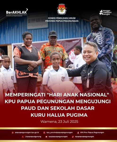 KPU Provinsi Papua Pegunungan Memeriahkan Hari Anak Nasional di Sekolah Dasar Kuru Halua Distrik Walelagama Kabupaten Jayawijaya Provinsi Papua Pegunungan Tahun 2025   Wamena, 23 Juli 2025. KPU Provinsi Papua Pegunungan ikut memeriahkan hari Anak Nasional Tahun 2025 dengan tema “Anak Hebat, Indonesia Kuat Menuju Indonesia Emas 2045" di Sekolah Kuru Halua Yayasan Pendidikan Papua Pegunungan di Kampung Pugima Distrik Walelagama Provinsi Papua Pegunungan. Historisasy Paud Kuru Halua berdiri sejak tahun 2016 sedangkan Sekolah Dasar Kuru Halua berdiri sejak tahun 2023 dengan bantuan dari pemerintah daerah. Beratapkan seng dan dialasi rumput anak-anak ini belajar dengan fasilitas seadanya. Guru PAUD dan SD Sekolah Dasar berjumlah 8 orang. Jumlah siswa PAUD sekitar 50 anak. Sedangkan (SD) Sekolah Dasar total murid 37 anak. Rinciannya, Kelas I jumlah siswa 10 anak, Kelas II 12 anak, Kelas III 15 anak. Kunjujngan ini sebagai bentuk sosialisasi dalam momen Hari Anak Nasional ini penting untuk menciptakan generasi anak yang sehat, cerdas, tangguh, dan berdaya dalam rangka menyambut 100 tahun kemerdekaan Indonesia di tahun 2045. Acara ini diikuti oleh staff serta para pimpinan di KPU Provinsi Papua Pegunungan. Sekretaris KPU Provinsi Papua Pegunungan Agus Filma mengatakan bahwa “bantuan yang diberikan dapat dijadikan motivasi untuk belajar lebih baik lagi kedepannya sehingga semakin belajar dalam menuntut ilmu”. Dalam waktu yang sama, anggota KPU Provinsi Papua Pegunungan "Naftali Emanuel Paweka memberikan motivasi bahwa “Dunia pendidikan itu sangatlah penting dalam memajukan suatu bangsa dan tetap semangat dalam menggapai impian bagi siswa/i terlebih khusus Provinsi Papua Pegununga”. Hari Anak Nasional menjadi momentum pengingat bahwa anak-anak adalah pondasi masa depan bangsa. Menjaga kesejahteraan dan melindungi mereka adalah investasi penting untuk menjamin Indonesia yang lebih baik di masa mendatang. Anak adalah harta paling berharga yang perlu dijaga, dibimbing, dan diberdayakan. Meningkatkan kesadaran publik tentang pentingnya menjaga dan melindungi anak-anak. Perlu mendorong pemenuhan hak-hak anak serta menciptakan lingkungan yang sehat, aman, dan mendukung tumbuh kembang mereka. Mengapresiasi kontribusi anak-anak dalam kehidupan bermasyarakat serta mendorong peran aktif mereka dalam proses pembangunan. Kepala sekolah Kuru Halua di Pugima Provinsi Papua Pegunungan Tihe Lokobal mengucapakan “banyak terimakasih kepada KPU Provinsi Papua Pegunungan memberikan bantuan sembakau dalam momen hari Anak Nasional. Keadaan sekolah seperti ini maka besar harapan kedepan Kami membutuhkan bantuan dalam berupa bangunan Gedung sekolah, mulai dari Tingkat PAUD dan Sekolah Dasar (SD)”. Meningkatkan kesadaran publik tentang pentingnya menjaga dan melindungi anak-anak. Perlu mendorong pemenuhan hak-hak anak serta menciptakan lingkungan yang sehat, aman, dan mendukung tumbuh kembang mereka. Mengapresiasi kontribusi anak-anak dalam kehidupan bermasyarakat serta mendorong peran aktif mereka dalam proses pembangunan. Dengan demikian KPU Provinsi Papua Pegunungan mewujutkan sosialisasi bahwa Pendidikan adalah landasan utama mencerdaskan bangsa dengan kontribusi aktif kepada anak-anak. Anak-anak SD Kuru Halua dan secara umum anak-anak di Provinsi Papua Pegunungan menjadi potret untuk mendorong generasi “Anak Hebat, Indonesia Kuat Menuju Indonesia Emas 2045”.