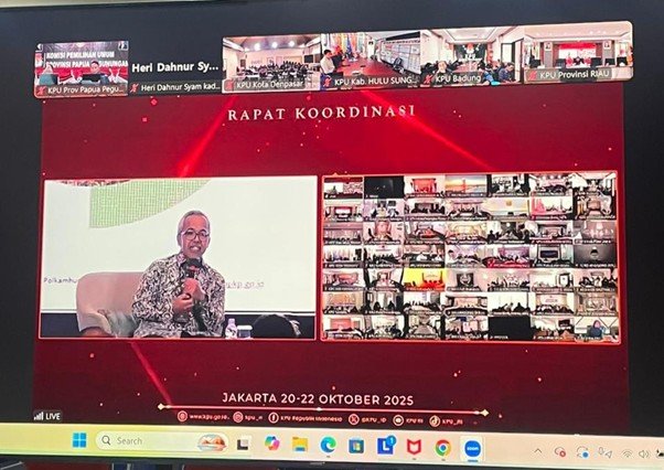 Wamena – Komisi Pemilihan Umum (KPU) menggelar Rapat Koordinasi Pengawasan dalam rangka peningkatan dan penguatan kinerja pengawasan di lingkungan KPU, KPU Provinsi dan KPU Kabupaten/Kota pada hari Selasa, 21 Oktober 2025 yang dihadiri oleh Bapak. Bernad Dermawan Sutrisno selaku Sekretaris Jendral Komisi Pemilihan Umum Republik Indonesia, Ibu. Iffa Rosita selaku Komisioner Divisi Hukum dan Pengawasan, Bapak Agus Filma selaku Sekretaris KPU Provinsi Papua Pegunungan dan seluruh jajaran pejabat maupun pegawai di lingkungan KPU RI, KPU Provinsi dan KPU Kabupaten/Kota melalui tatap muka dan Zoom.