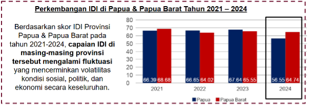 Gambar diatas menunjukkan pergerakan fluktuatif pada beberapa wilayah di Indonesia yaitu di Provinsi Papua dan Papua Barat sebelum pembentukan beberapa Daerah Otonom Baru di Pulau Papua. Secara umum, IDI Indonesia masih berada pada kategori “sedang”, hal ini menunjukkan bahwa demokrasi Indonesia terus berkembang meski menghadapi tantangan. Meskipun tidak mengalami lonjakan signifikan, ini menandakan bahwa proses demokrasi di Indonesia masih berjalan dinamis di tengah berbagai tantangan sosial dan politik. Pemerintah bersama masyarakat sipil diharapkan terus memperkuat komitmen terhadap nilai-nilai kebebasan, partisipasi, dan akuntabilitas untuk menjaga kualitas demokrasi yang sehat dan berkelanjutan.