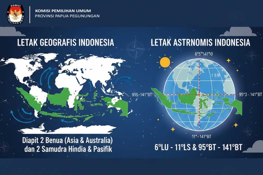 Jayawijaya - Indonesia dikenal sebagai negara kepulauan yang memiliki posisi sangat strategis, baik dilihat dari letak geografisnya maupun letak astronomisnya. Kedua aspek ini menjadi fondasi penting dalam memahami kondisi alam, iklim, sosial budaya, potensi ekonomi, hingga dinamika geopolitik Indonesia. Letak suatu wilayah tidak hanya menunjukkan posisinya di permukaan bumi, tetapi juga mempengaruhi pola kehidupan masyarakat yang tinggal di dalamnya. Karena itu, pembahasan mengenai letak geografis dan astronomis Indonesia menjadi materi penting dalam kajian geografi, pendidikan dasar, hingga studi strategis kenegaraan.