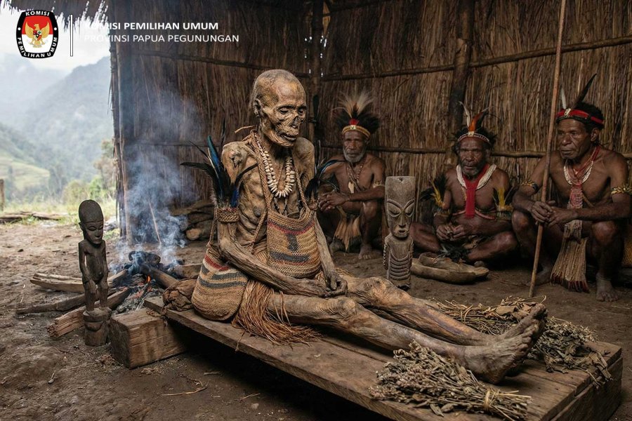 Jayawijaya - Papua bukan hanya dikenal dengan keindahan alamnya, tetapi juga menyimpan kekayaan budaya yang sangat tua dan berharga. Salah satu warisan budaya paling unik adalah tradisi mumi Papua, yang masih dijaga oleh masyarakat adat di wilayah pegunungan seperti Jayawijaya, Pegunungan Bintang, Dogiyai, hingga Lembah Baliem. Bagi KPU Provinsi Papua Pegunungan, memahami dan mengangkat kekayaan budaya lokal seperti mumi Papua menjadi bagian penting dalam memperkuat pendekatan komunikasi, pendidikan pemilih, dan layanan kepemiluan yang lebih dekat dengan identitas masyarakat setempat. Dengan mengenal tradisi leluhur, KPU dapat membangun program sosialisasi yang lebih berakar, bermakna, dan diterima oleh masyarakat adat di Papua Pegunungan.