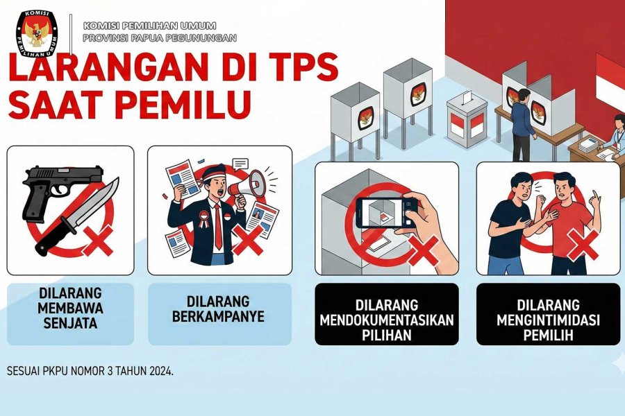 Aturan ini penting dipahami masyarakat Papua Pegunungan agar proses pemilu berjalan jujur, adil, dan sesuai prinsip Luber Jurdil. Berikut daftar lengkap larangan yang berlaku di TPS.