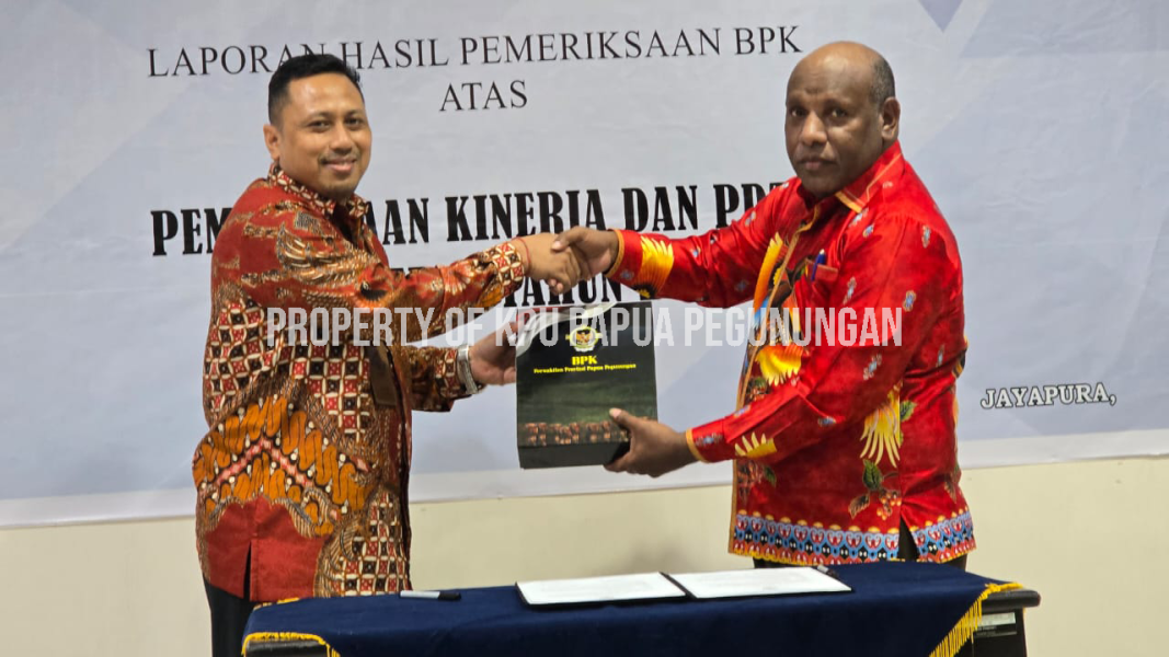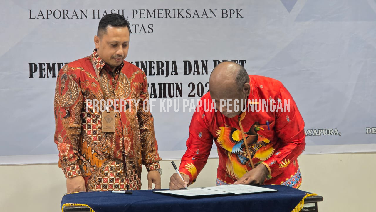 Jayapura - KPU Provinsi Papua Pegunungan bersama KPU Kabupaten Pegunungan Bintang, Yahukimo, Nduga, Yalimo, dan Lanny Jaya menghadiri kegiatan Penyerahan Laporan Hasil Pemeriksaan (LHP) Kepatuhan atas Pengelolaan Belanja Pemilihan Kepala Daerah Serentak Tahun 2024. Acara digelar pada Jumat, 12 Desember 2025, bertempat di Kantor BPK RI Perwakilan Provinsi Papua Pegunungan di Jayapura.