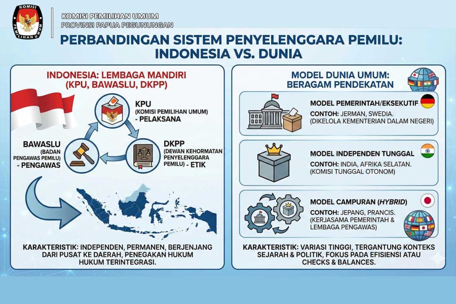 Di Indonesia, peran tersebut dijalankan oleh Komisi Pemilihan Umum (KPU). Jika dibandingkan dengan berbagai negara di dunia, KPU merupakan bagian dari praktik demokrasi modern yang mengedepankan independensi, akuntabilitas, dan keterbukaan.
