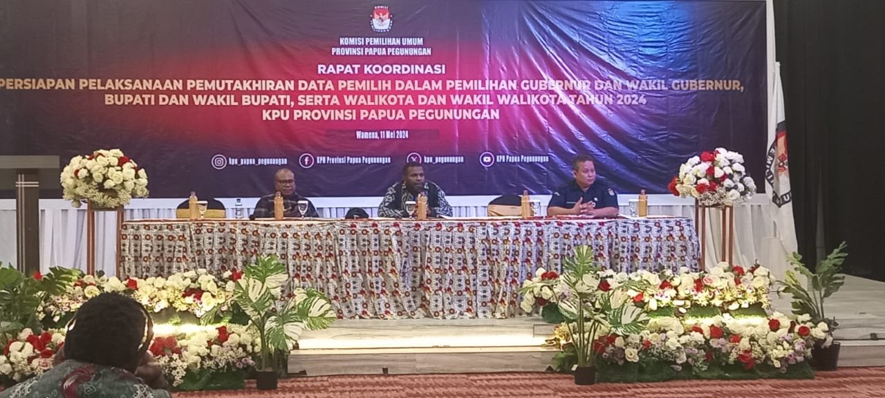 Wamena — Komisi Pemilihan Umum (KPU) Provinsi Papua Pegunungan menggelar Rapat Koordinasi Persiapan Pemutakhiran Data Pemilih untuk Pemilihan Gubernur dan Wakil Gubernur, Bupati dan Wakil Bupati, serta Wali Kota dan Wakil Wali Kota. (11-05-2024)