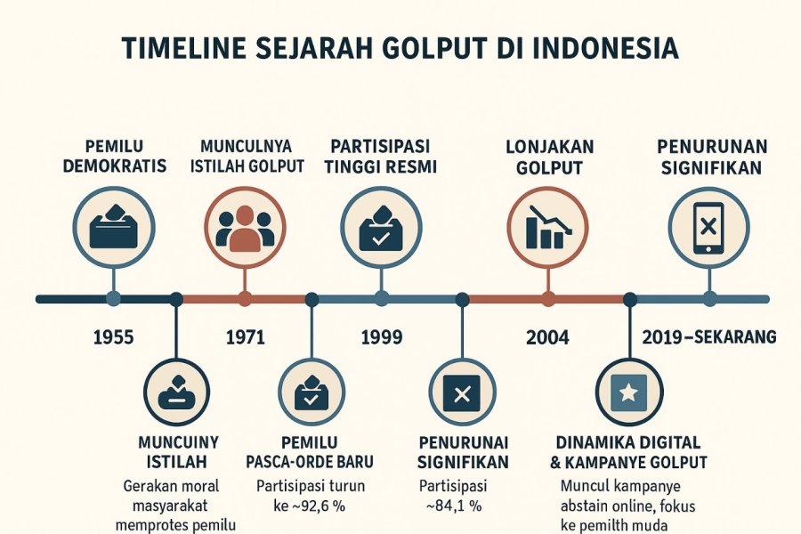 Sebelum istilah golput dikenal luas, Indonesia sudah lebih dulu melewati dua masa penting dalam perjalanan demokrasinya, yaitu masa demokrasi parlementer (1950–1959) dan demokrasi terpimpin (1959–1965). Saat Pemilu pertama tahun 1955, semangat masyarakat untuk ikut memilih sangat tinggi, dengan tingkat partisipasi mencapai sekitar 91,54 persen. Pemilu ini menjadi simbol euforia rakyat Indonesia yang baru saja merdeka dan bersemangat menjalankan demokrasi.