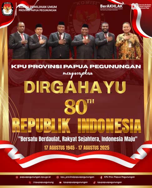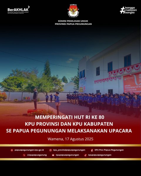 Seluruh jajaran keluarga besar KPU Se-Provinsi Papua Pegunungan sudah bersama-sama mengikuti upacara 17 Agustus Tahun 2025 di halaman Kantor KPU Jayawijaya ini dengan baik dan tertip. HUT ke-80 RI bermakna bebas dari kemiskinan dan penderitaan . Sekretaris Kabinet Teddy Indra Wijaya menyatakan “peringatan Hari Ulang Tahun (HUT) ke-80 Republik Indonesia menandai perjuangan untuk mencapai kemerdekaan yang lebih luas, yakni terbebas dari kemiskinan, kelaparan, dan penderitaan”.