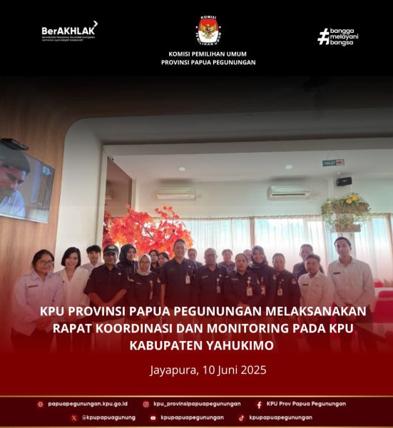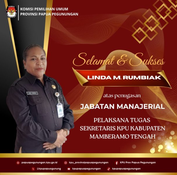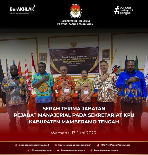 KPU Provinsi Papua Pegunungan, 13 Juni 2025. Serah Terima Jabatan Pejabat Manajerial pada Sekretariat Komisi Pemilihan Umum Kabupaten Mamberamo Tengah. Bertempat diaula Pilamo Demokrasi KPU Provinsi Papua Pegunungan. Serah Terima Jabatan Manajerial, Josep Erren Liding kepada Linda M Rumbiak sebagai Pelaksana Tugas Sekretaris KPU Kabupaten Mamberamo Tengah.