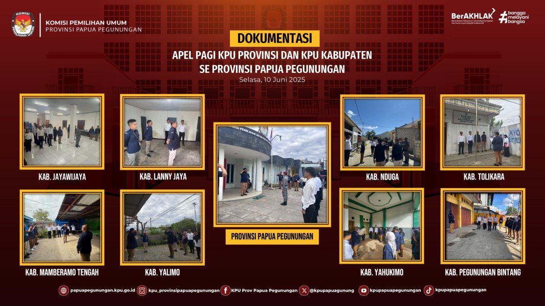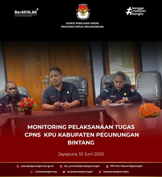 Pastikan Penempatan Seluruh PNS Se-Provinsi Papua Pegunungan Tahun 2025. Pada tanggal 10 Juni 2025 Sekretaris KPU Provinsi Pegunungan Papua Agus Filma bersama Kepala bagian Perencanaan, Data, Informasi, Partisipasi Hubungan Masyarakat dan SDM melakukan kunjungan ke kantor perwakilan KPU Kabupaten Pegunungan Bintang di Jayapura. Dalam kunjungannya melihat dan memastikan penempatan pegawai Aparatur Sipil Negara (ASN) pada Subbagian di Lingkungan Sekretariat Komisi Pemihan Umum Kabupaten Pegunungan Bintang Tahun 2025 Kunjungan ini dalam rangka peningkatan tugas, fungsi, dan kinerja serta mendukung lancarnya pelaksanaan tugas. Sekretaris Agus Filma menyatakan bahwa "dipandang perlu untuk melakukan penempatan pegawai Aparatir Sipil Negara dalam setiap subbagian pada Sekretariat Komisi Pemilihan Umum Kabupaten Pegunungan Bintang. Artinya berdasarkan pertimbangan sebagaimana perlunya ada penempatan Keputusan Sekretaris KPU Kabupaten Pegunungan Bintang". Dengan demikian kunjungan ini merupakan awal menempatkan pegawai Aparatur Sipil Negara berdasarkan pedoman ketentuan peraturan-undangan subbagian di Lingkungan Sekretariatan.
