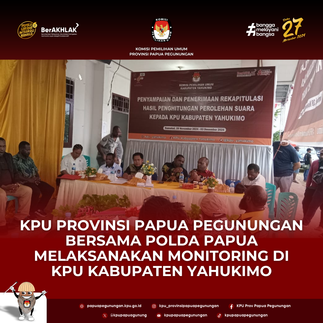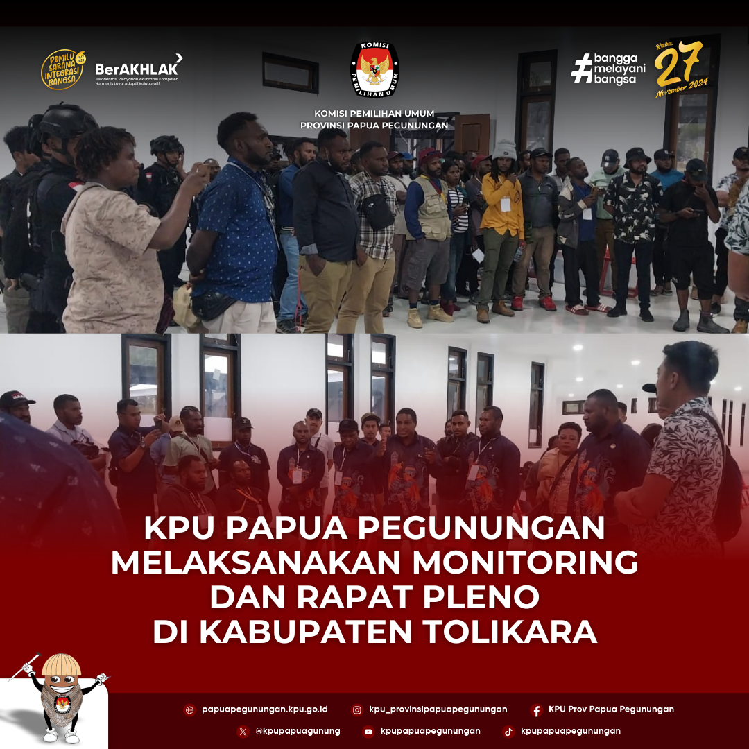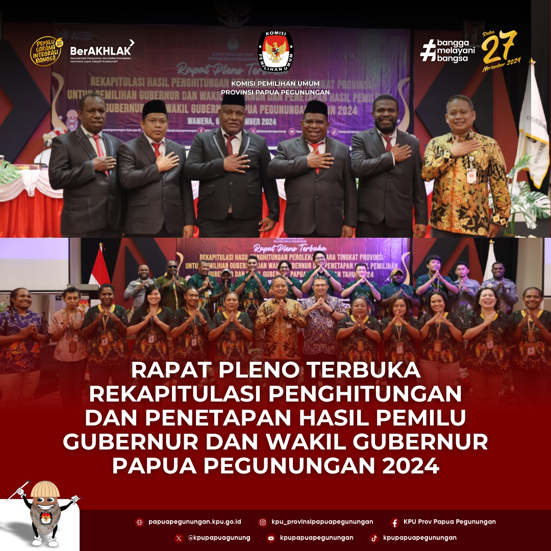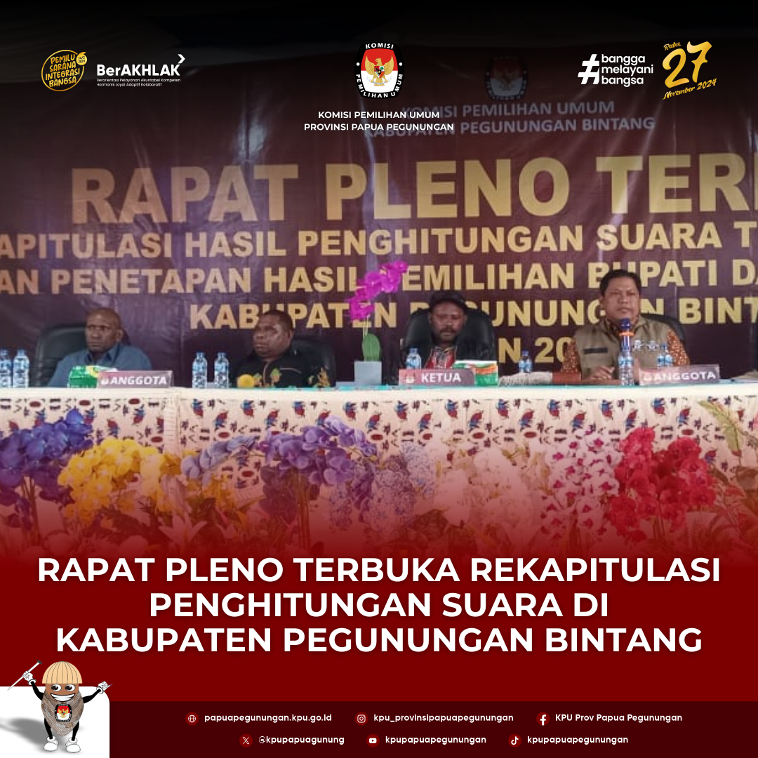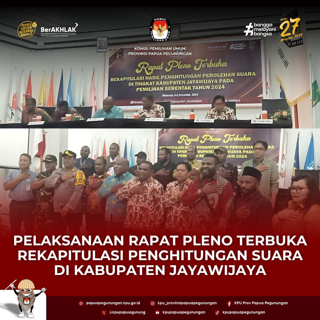 Rapat Pleno Terbuka Rekapitulasi Hasil Penghitungan Perolehan Suara Tingkat Kabupaten di Jayawijaya dihadiri KPU Provinsi Papua Pegunungan, 5 Desember 2024. Berdasarkan SK No. 1810 dan tentang pengambil ahli tugas 3 Komisioner yang diberhentikan (Keputusan DKPP) dan salah satunya merehabilitasi nama baik. Dalam sambutan ketua KPU Provinsi Papua Pegunungan, Daniel Jingga menyampaikan bahwa KPU Provinsi Papua Pegunungan mendapat pengambilalihan tugas untuk melaksanakan tahapan kegiatan rekapitulasi hasil perolehan suara dengan dasar undang-undang 10 Tahun 16 tentang Pilkada serentak seluruh Indonesia, PKPU Tahun 2017. PKPU No.18 Tahun 2024 mengenai pemungutan tingkat KPPS sampai pusat. KPU Provinsi Papua Pegunungan mengajak seluruh masyarakat untuk menjaga kedamaian dalam proses rekapitulasi Pemilihan Gubernur dan Wakil Gubernur. Pilkada Damai, Papua Pegunungan Bangkit! #KPUMelayani #PilkadaSerentakTahun2024 #TemanPemilih #KPUPapuaPegunungan #PilkadaPapuaPegunungan #PilkadaDamaiPapuaPegununganBangkit